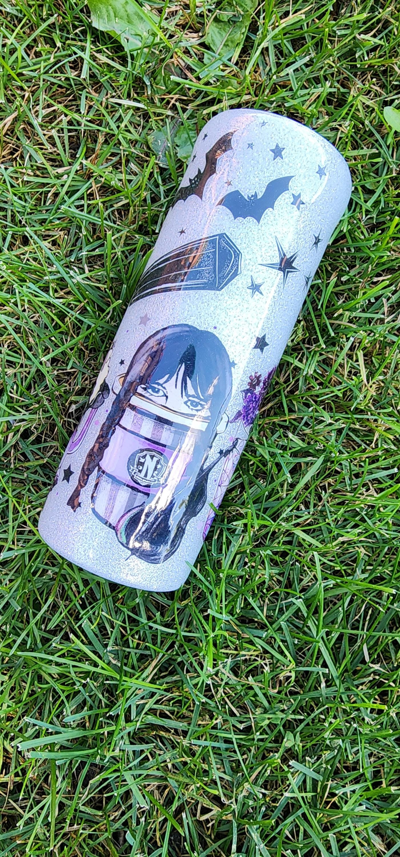Channel your inner dark queen 🖤 with this handmade Wednesday Addams epoxy tumbler. Perfect for coffee ☕, tea 🍵, or any potion that fuels your brooding vibes. This goth-inspired 20oz glitter tumbler combines style ✨, functionality ⚡, and attitude 😈—ideal for Halloween 🎃, everyday use, or gifts 🎁 for spooky souls.