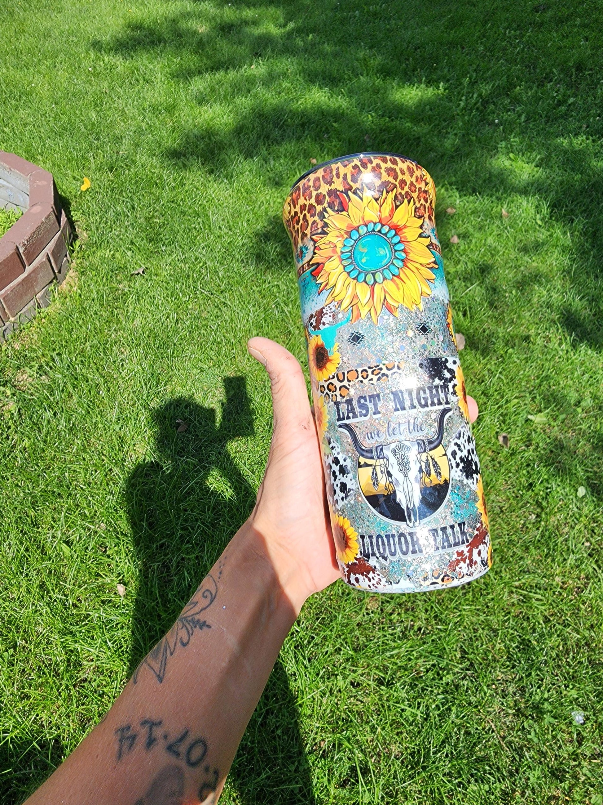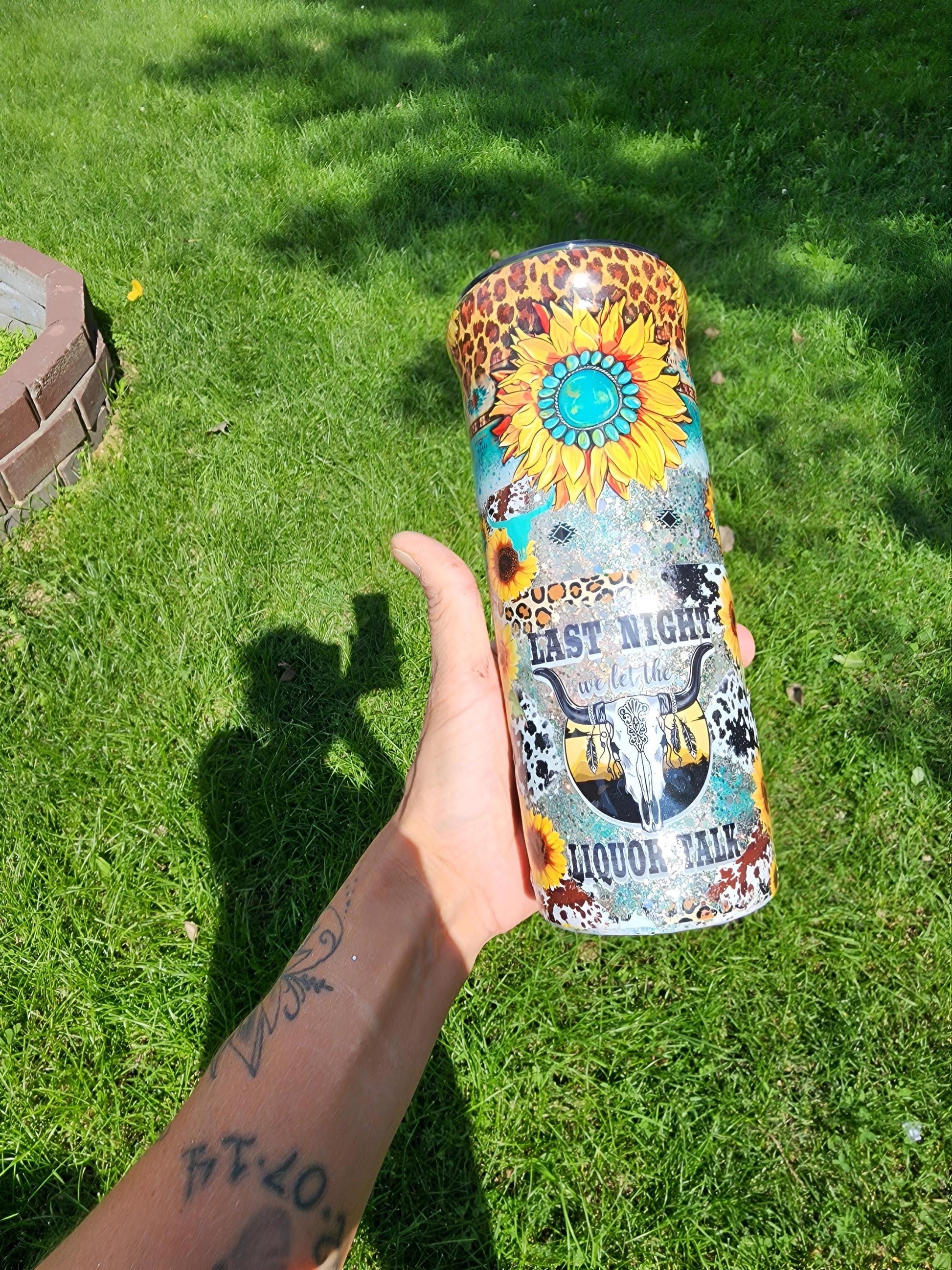 This 20 oz Western-style epoxy tumbler features the bold phrase “Last Night We Let the Liquor Talk”—perfect for country music lovers, bachelorette gifts, or just living that wild rodeo life. With a rustic cowgirl vibe and glossy epoxy finish, this tumbler is built to turn heads and keep your drinks cold (or hot!) for hours.